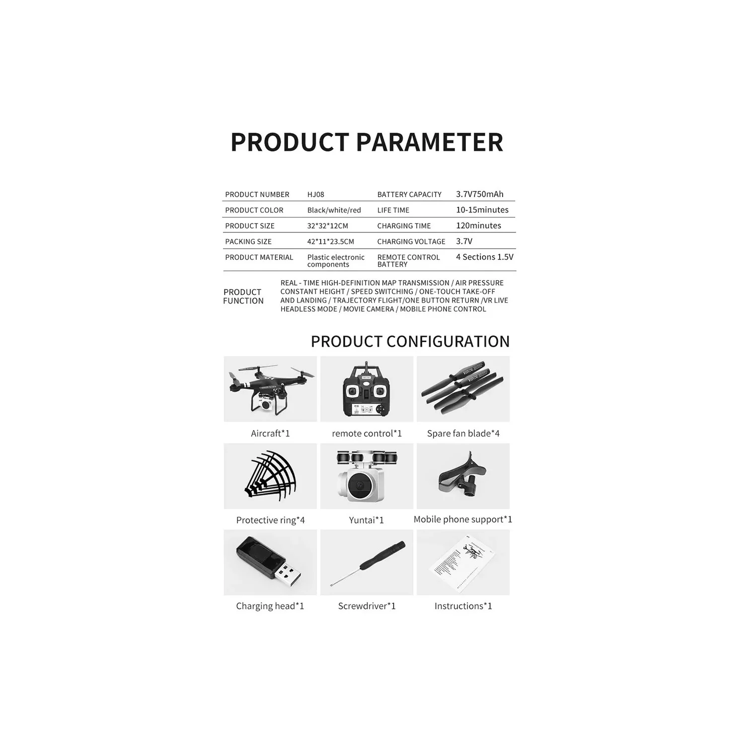 Contenido: 1x Quadcopter 1x cámara 1x Control remoto 1x destornillador 1x USB 4x Protectores de hélice 4x Hélices de repuesto 1x batería integrada de cuadricóptero 1x Soporte clip de teléfono 1x manual